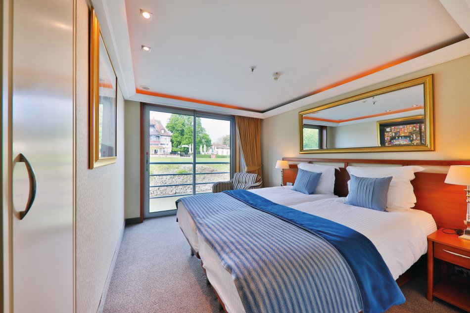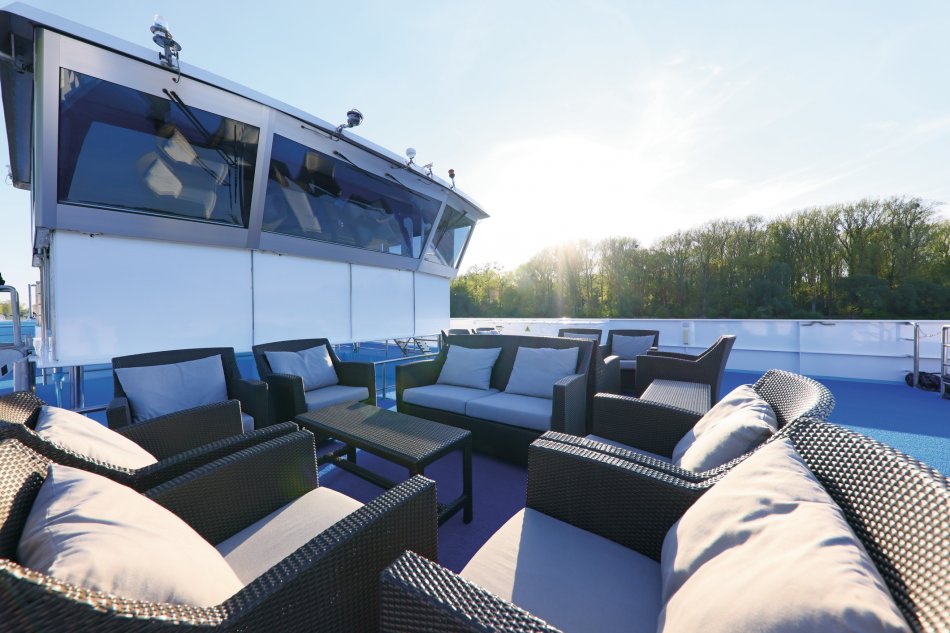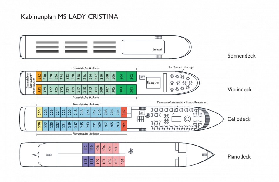 Ausstattung: Komfort-Class für 144 Gäste, 2 Restaurants (Spezialitätenrestaurant gegen Aufpreis), Panorama-Lounge, Bar, Fitnessraum, Sauna, kleiner Whirlpool, Sonnendeck. Fahrstuhl zwischen dem Cello- und Violindeck und ein Treppenlift zum Sonnendeck. Das Pianodeck ist nur über eine Treppe erreichbar. WLAN inklusive. Kabinen: Außenkabinen ca. 15m², DU/WC, Föhn, TV, Telefon, Safe, Klimaanlage. Auf dem Pianodeck sind die Kabinen mit Fenstern ausgestattet, die nicht geöffnet werden können. Auf dem Cello- und Violindeck haben die Kabinen einen französischen Balkon.