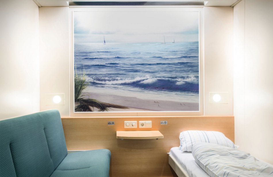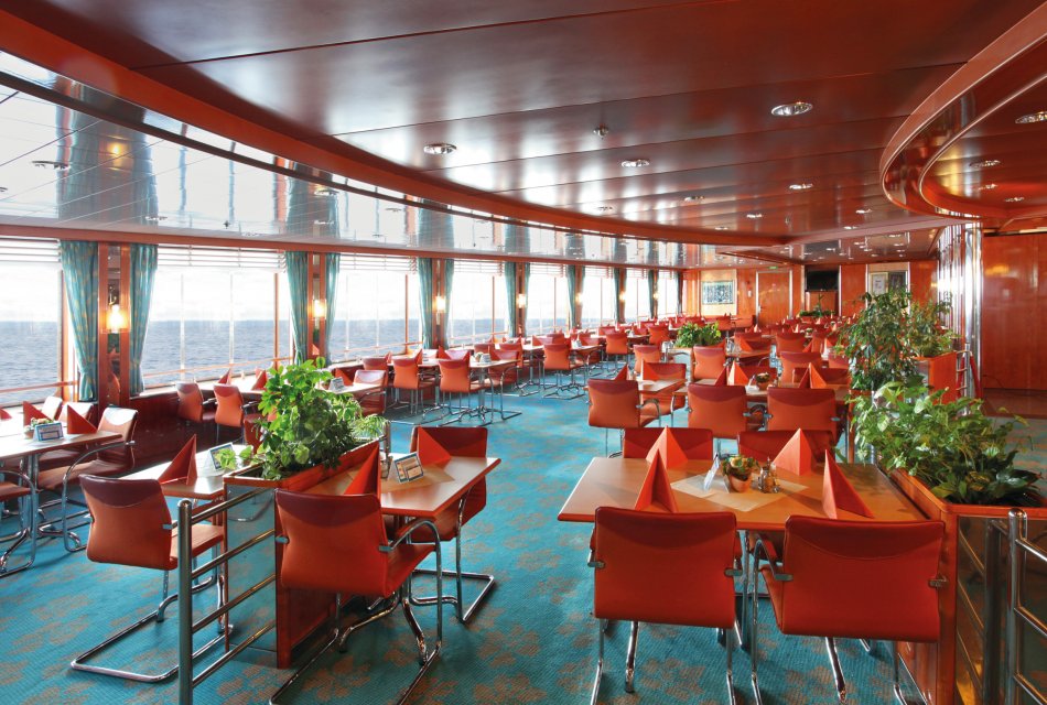 An Bord: Restaurant, Panorama Bar, Kino, Bord Shop, Wellness-Center. Kabinen: Etagenbetten/untere Betten oder 2 einzelne Betten, DU/WC, Föhn, TV.