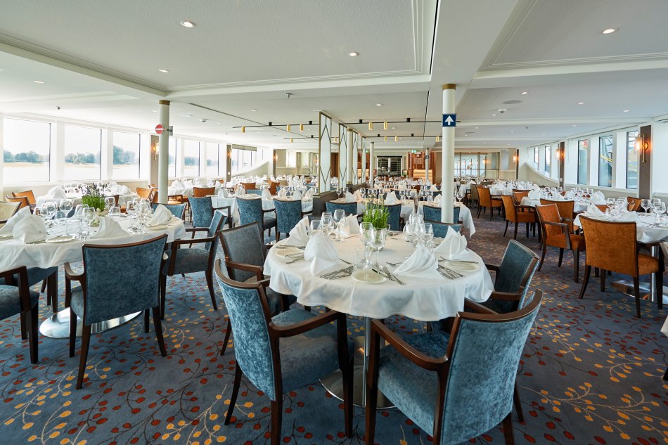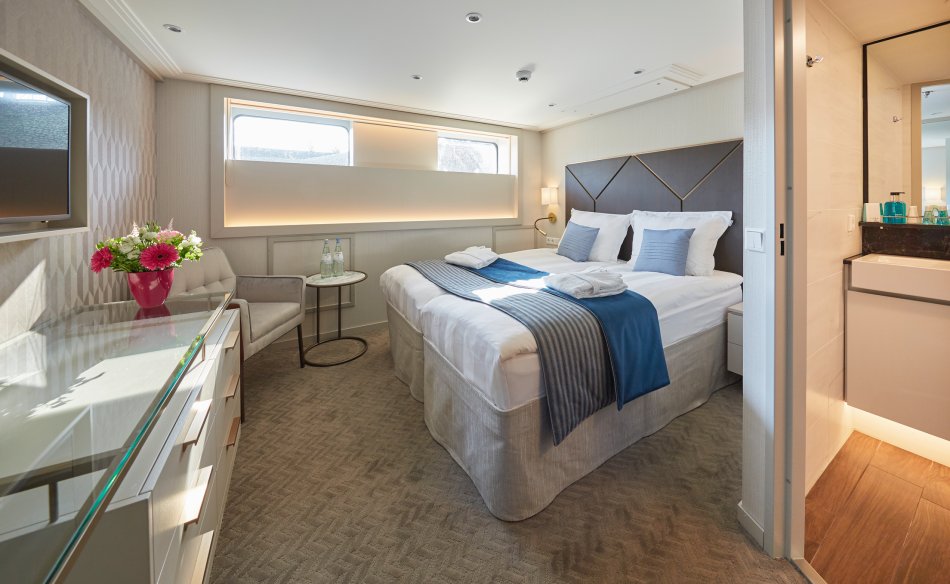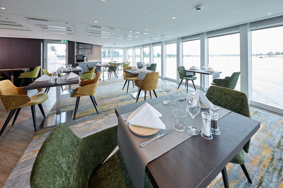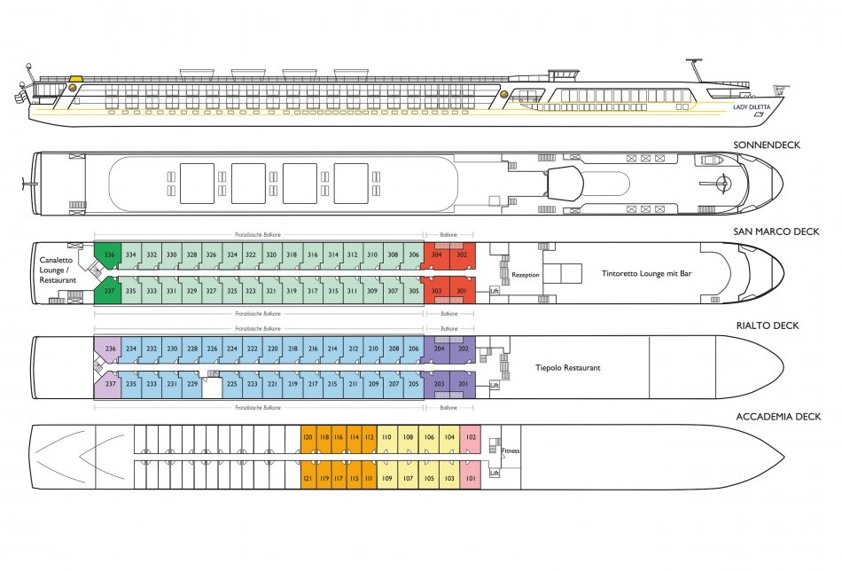 Ausstattung: Komfort-Class, Neubau von 2020 im italienischen Stil für 173 Gäste. 2 Restaurants, Lounge, Rezeption mit Lobby, Sonnendeck mit Liegestühlen, Sonnensegeln, Panorama-Bar, Fitness-Bereich, Fahrstuhl bzw. Treppenlift zu allen Decks, WLAN inklusive. Kabinen: Außenkabinen, DU/WC, Föhn, TV, Telefon, Safe, Klimaanlage. Accademia Deck (ca. 11-15,5m²) mit nicht zu öffnenden Fenstern, San Marco und Rialto Deck (ca. 16-21m²) mit französischem Balkon.