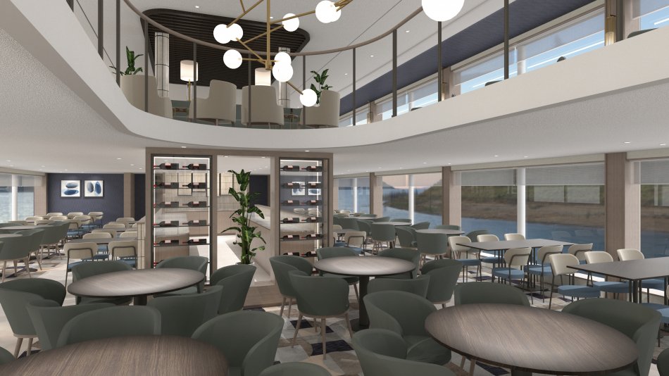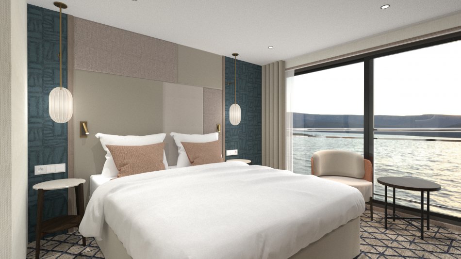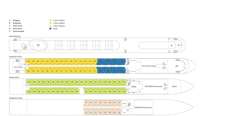 Die 2-Bett Kabinen haben eine Größe von 15m² auf allen Decks. Alle 95 Kabinen sind Außenkabinen und verfügen über DU/WC, Föhn, Safe, Flatscreen-TV, Telefon, Klimaanlage und bodentiefe Panoramafenster, teilweise auch mit französischem Balkon. Auf dem Schiff befinden sich zwei Restaurants und ein Bistro, eine Bar mit Panorama Lounge, ein Putting Green, ein Schwimmbad, ein Bordshop, ein Fitness-/Wellnessbereich. Aufzug zwischen Rubin und Diamant Deck (6 Stufen zu Smaragd-Deck und Sonnendeck).