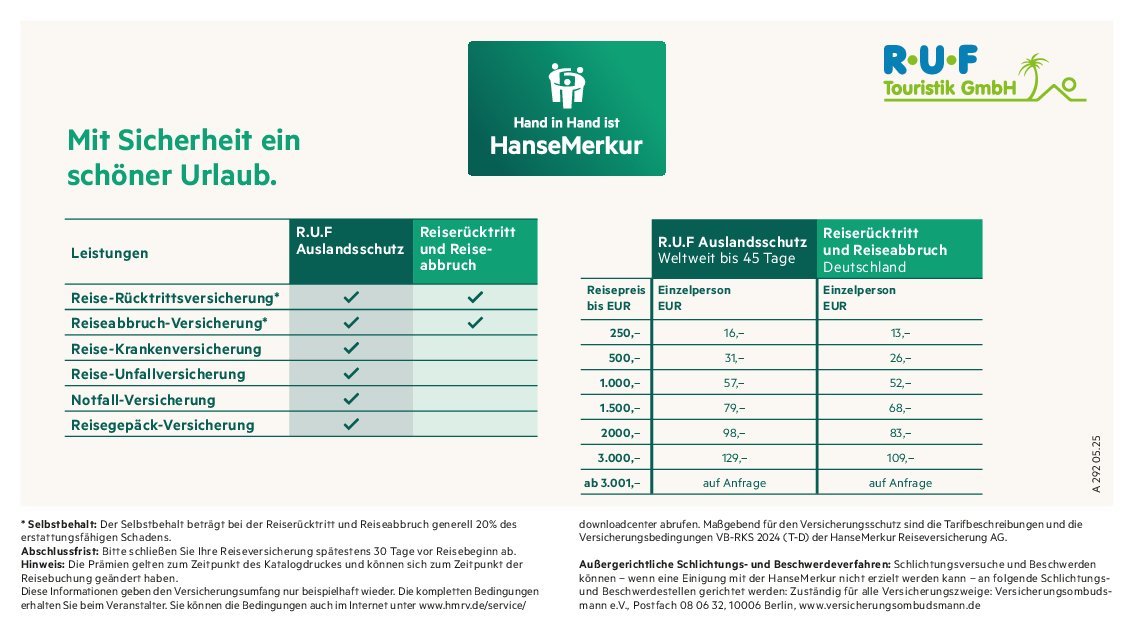 Mit Sicherheit ein schöner Urlaub – schließen Sie bis spätestens 30 Tage vor Reiseantritt eine unserer R.U.F.-Reiseversicherungen ab und genießen Sie den Urlaub auf unbeschwerte Weise. Wir können Ihnen neben einem Auslandsschutzpaket, das die Reiserücktrittsversicherung, Reise-Krankenversicherung und -Unfallversicherung beinhaltet, auch eine Reiserücktritt- und Abbruch_Versicherung für alle Reisen innerhalb von Deutschland anbieten. Diese greift sogar für Kurzaufenthalte im Ausland bis maximal 48 Stunden Dauer. Sie haben noch Fragen rund um unsere Versicherungen oder Bonussysteme, die Ihnen Ersparnisse für Ihre nächste Reise garantieren? Gerne beraten wir Sie in einem individuellen Gespräch – rufen Sie uns an oder besuchen Sie zu uns im R.U.F. Reisebüro!